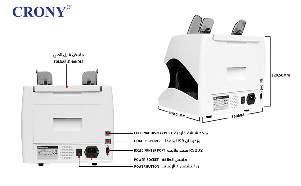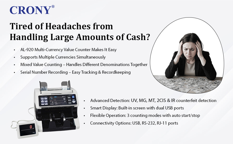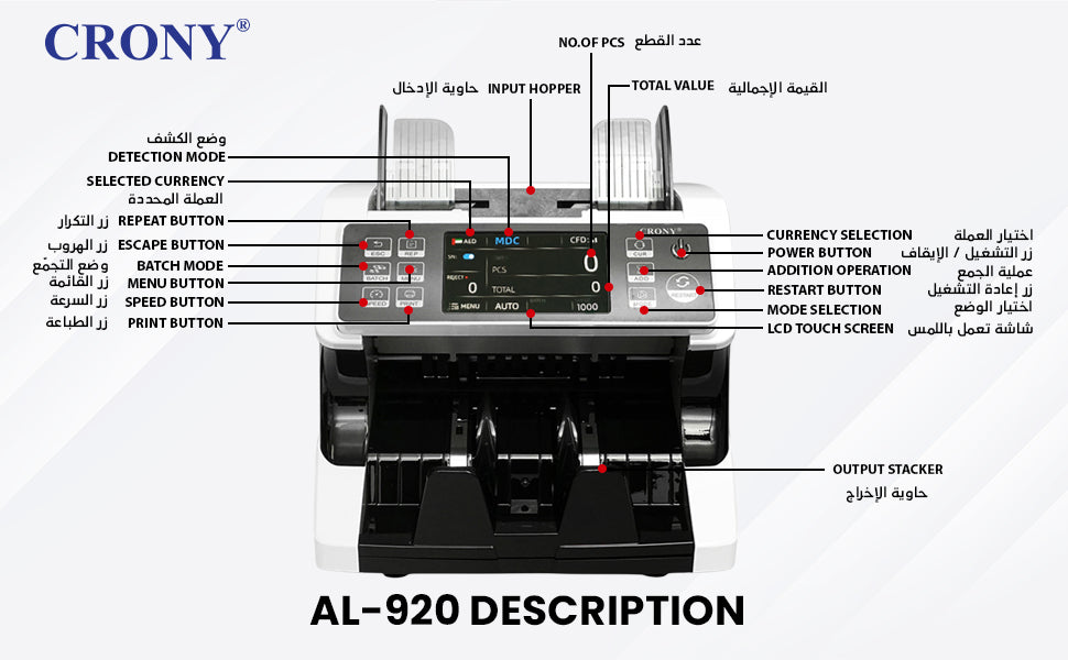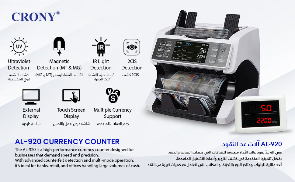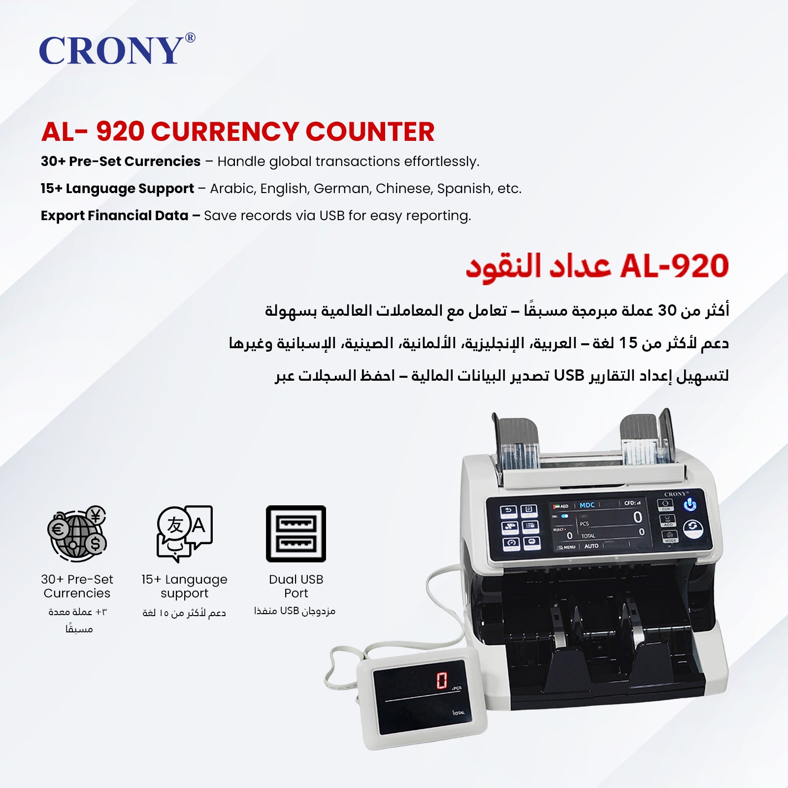 جهاز عد النقود عالي الجودة CRONY AL-920 للتحقق من الأوراق النقدية متعدد العملات والقيم مزدوج