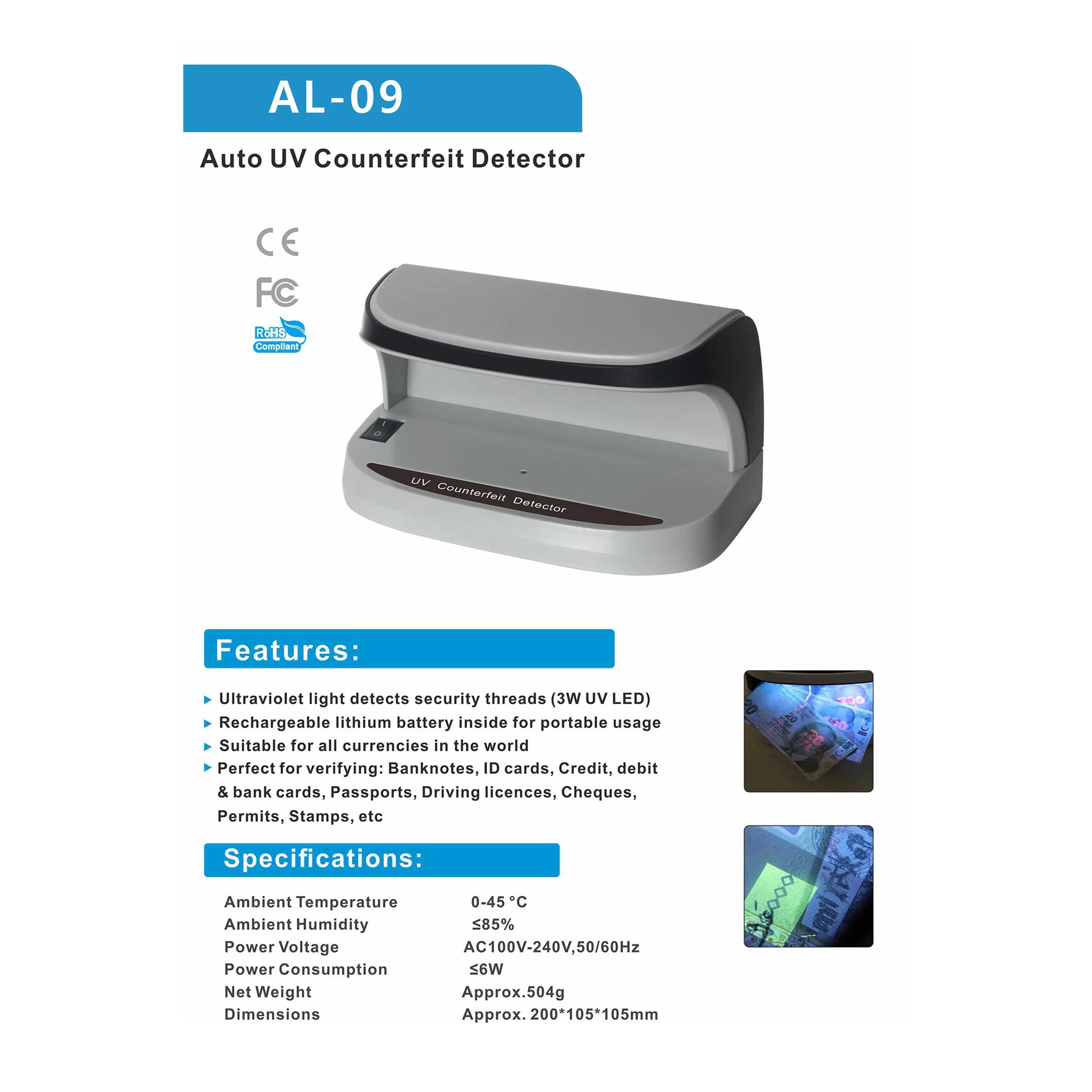 جهاز التحقق من الأوراق النقدية CRONY AL-09 أوتوماتيكي للكشف عن النقود المزيفة بالأشعة فوق البنفسجية جهاز صغير محمول لفحص النقود المزيفة بجهاز مسح بالأشعة فوق البنفسجية