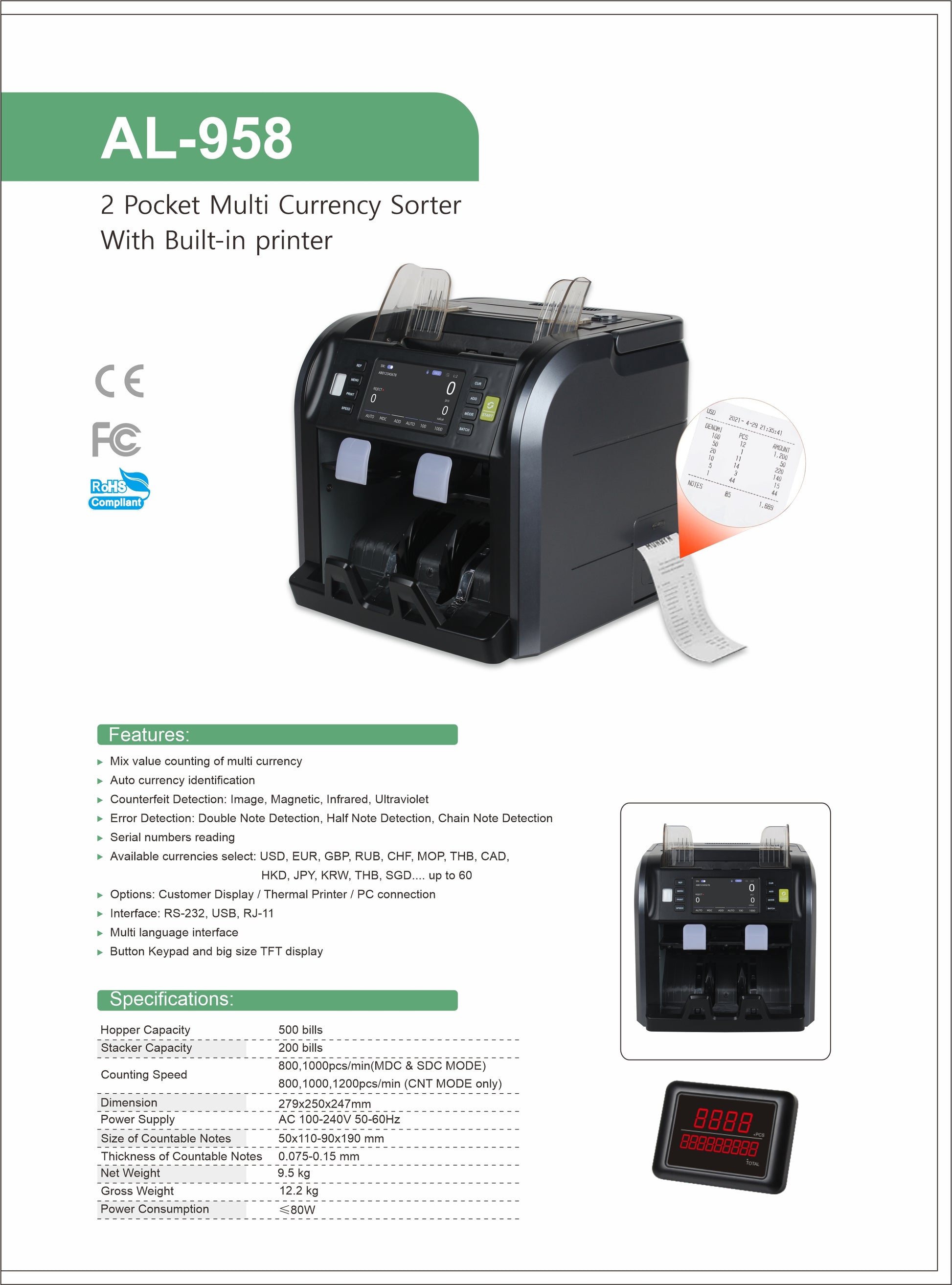 كروني AL958 AL-958 عداد نقود متعدد العملات آلة فرز النقود عداد الأوراق النقدية مع كشف الأوراق المزيفة عداد النقود