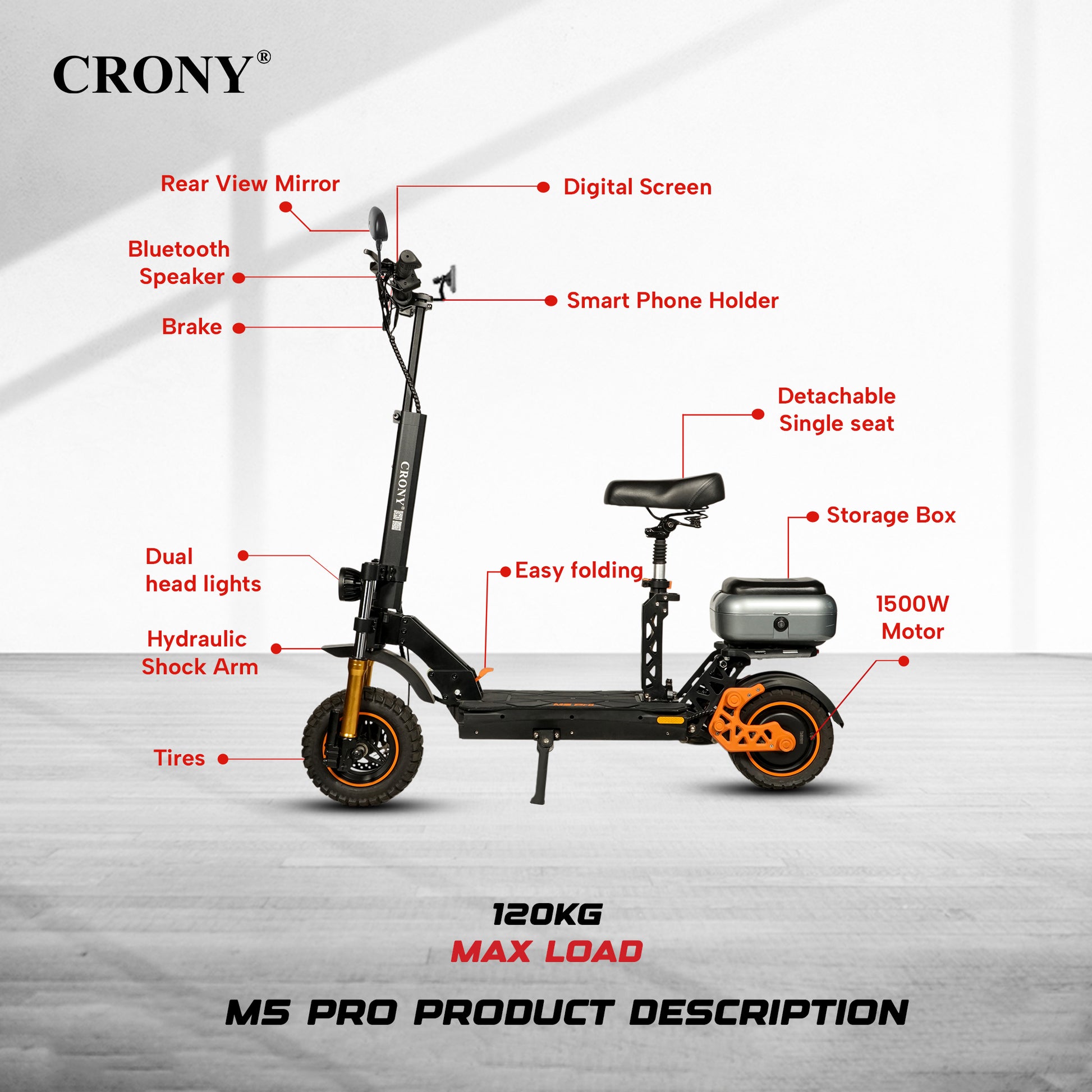سكوتر كهربائي CRONY M5 Pro للكبار والأطفال مع مكبر صوت بلوتوث واتصال بالتطبيق